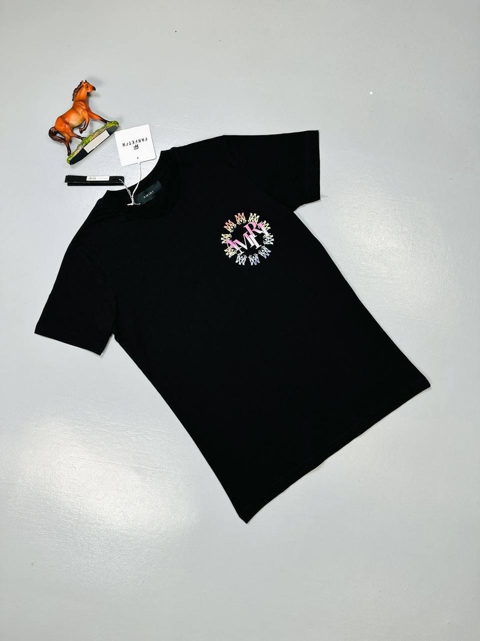 The Amiri Men’s T-Shirt combines subtle elegance with bold streetwear vibes. Crafted from soft cotton, it features a small round AMIRI logo on the front chest for a refined touch, and a striking large graphic logo on the back that makes a statement.