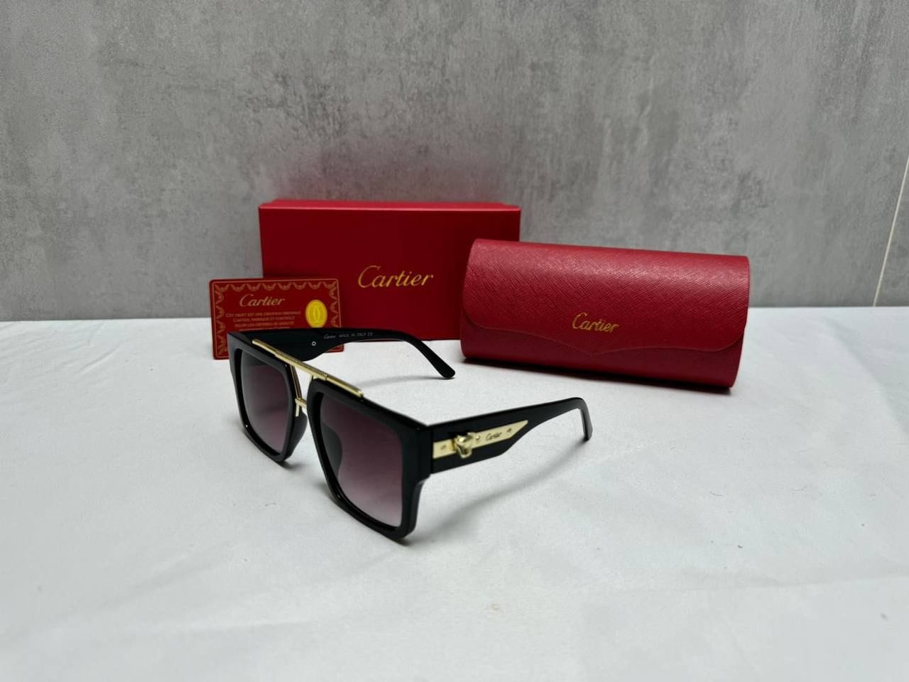 ntroducing the Cartier Square Frame Sunglasses – the ultimate statement of luxury and style. Featuring a refined brown acetate frame with gleaming gold-tone accents, these sunglasses are a timeless addition to any collection. The bold square shape offers a sophisticated touch, while the lenses provide 100% UV protection, ensuring both functionality and elegance.