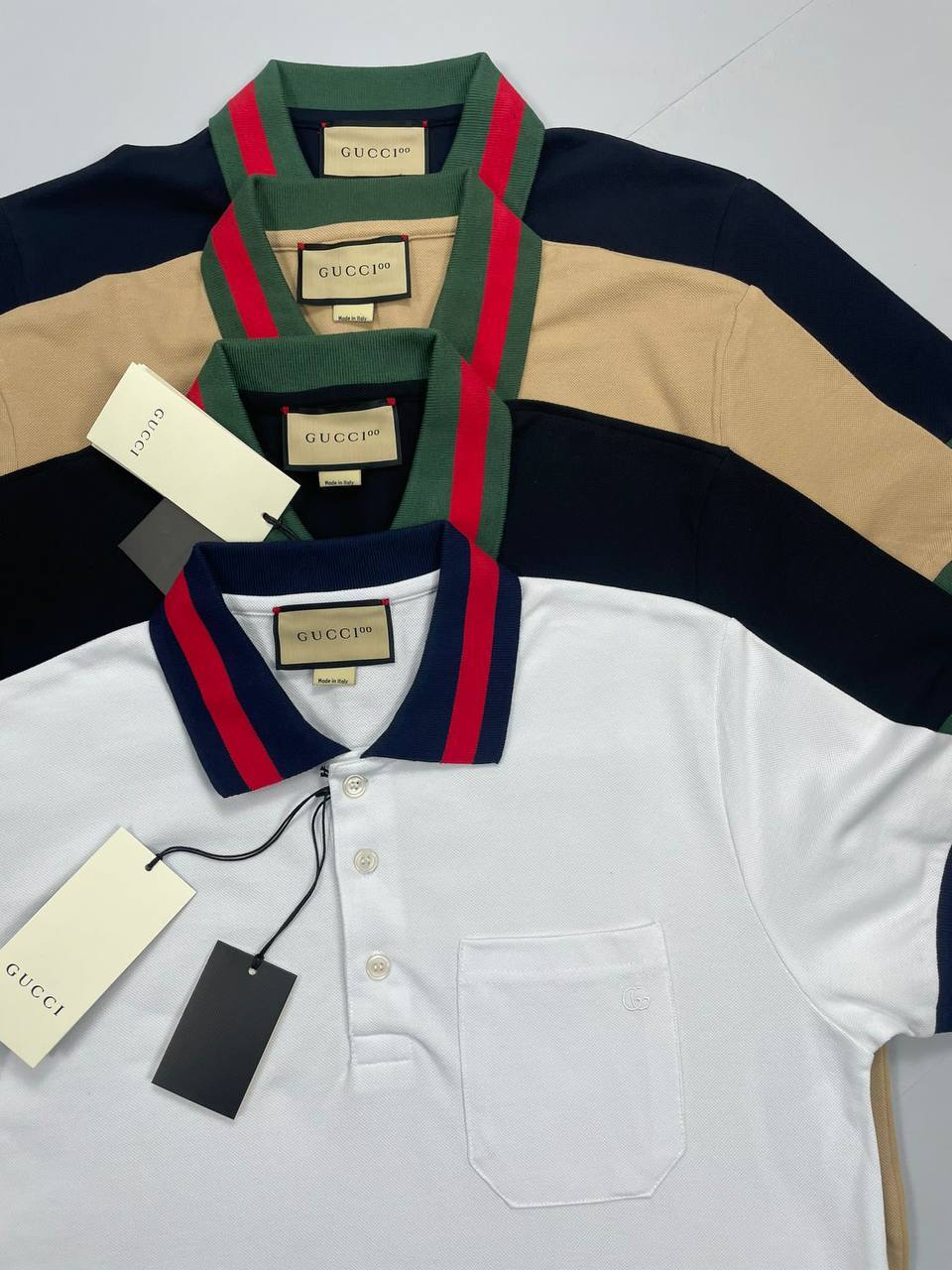 Gucci Polo Piquet T-Shirt With Web Collar In Black Blue White And Beige Colors