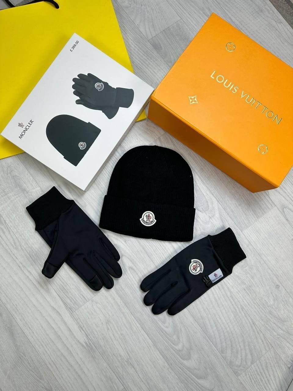 Moncler Knit Beanie & Gloves Set – Ribbed Design with Logo Patch