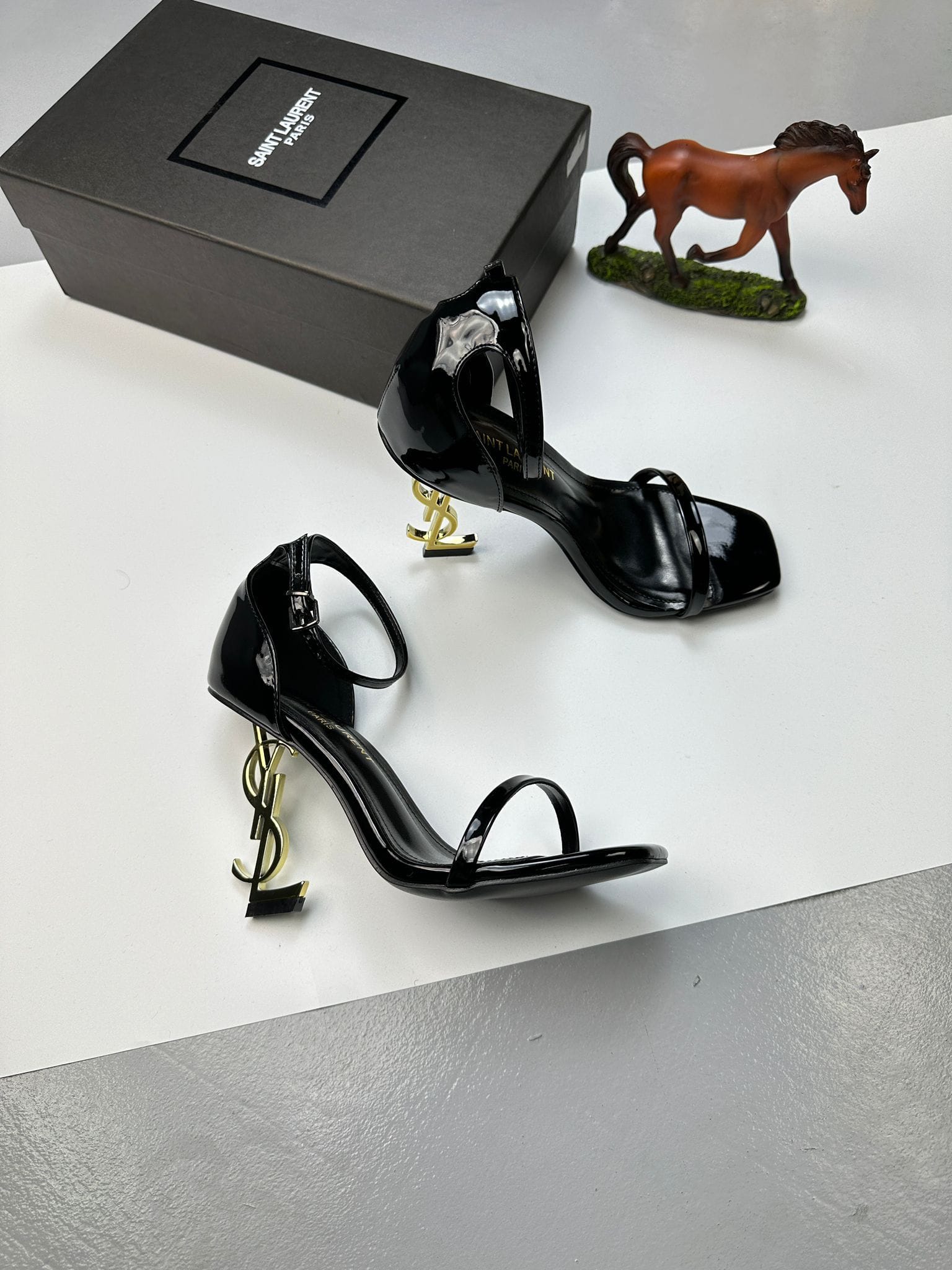 Introducing the YSL Opyum Sandals for Women — a bold designer statement in sleek black patent leather, finished with the iconic gold-toned YSL logo heel. The glossy upper features a minimalist square open toe, paired with a slim ankle strap for an elegant and secure fit. These heels bring together luxury and confidence, making them a perfect choice for evening wear, events, or special occasions.